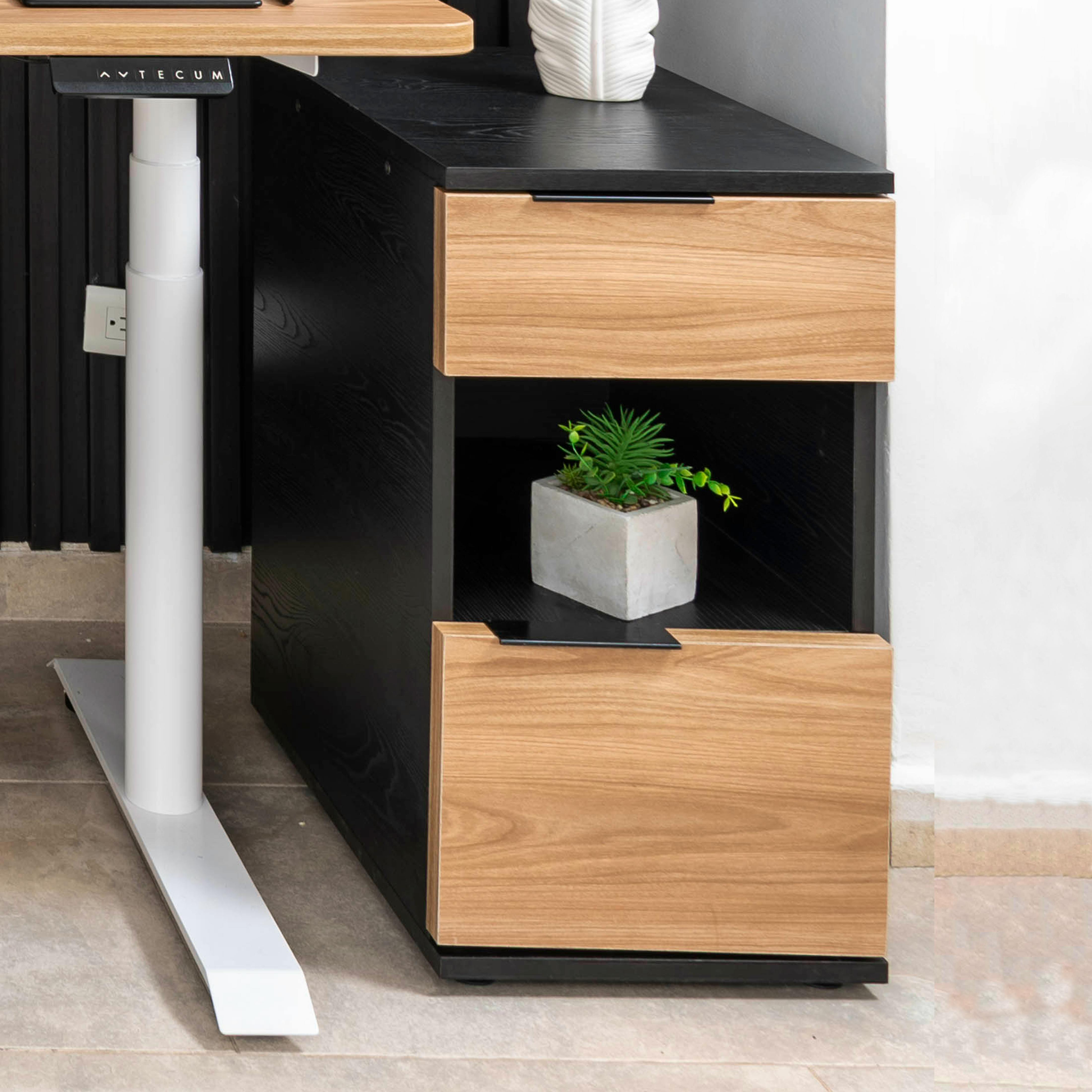 Los cajones inferiores son ideales para guardar documentos, cables y objetos que no necesitas a la vista, manteniendo un entorno limpio y enfocado.